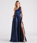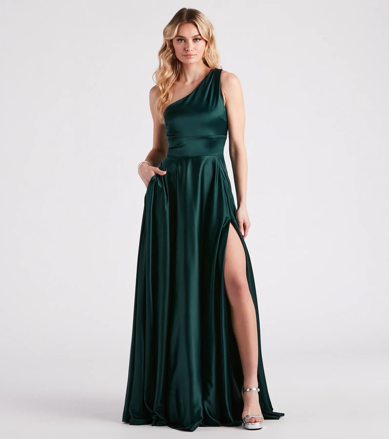 Sleek with an elegant style, the Katherine satin formal dress will turn heads at dances, galas, or any soiree! She features a sleeveless asymmetric one-shoulder neckline with a pleated shoulder strap, an asymmetric strappy back design, built-in padded cups that eliminate the need for a bra, a fitted bodice with dual high waist seams, a floor-sweeping skirt with a dramatic A-line silhouette, and a chic high front slit. The woven satin fabric includes a full-length lining. Complete your look with rhinestone statement earrings.