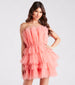 Capture the attention of the room in the Kayla ruffled tulle party dress that brings the voluminous fashion! She features a strapless square neckline with non-slip grip lining, an elasticized cinched waist, and a ruffled tiered short-length silhouette. The formal dress is composed of a tulle mesh fabric with a sewn-in knit lining and minimal stretch. Style with sparkly glitter heels and a chic clutch to complete the look!Â