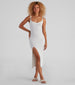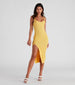 Keep your look light and effortless in this sweater midi dress perfect for any day or night summer event! It features a sleeveless, v-neck, spaghetti straps, a bodycon silhouette, and a sultry front slit. Complete the look in strappy sandals.Â