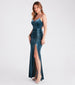 A timelessly glamorous style for bridesmaids or wedding guests, the Kierra Formal Glitter Velvet High Slit Dress brings sophistication and elegance. She features a sleeveless sweetheart neckline with a wired insert, bungee spaghetti straps, a padded bust, and a back cutout with a hook-clasp closure. Her front ruched seam and high front slit provide an alluring texture, while the long-length hem and A-line silhouette promise a flattering fit. Glittering velvet knit fabric offers the perfect sparkling touch and has a bust lining and moderate stretch. Complete the look in a necklace and earrings set.