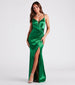 Stunning for prom or bridesmaids, step out in the Kiley formal satin dress for your next fancy night out! She features a sleeveless V-neckline with sheer mesh inserts, adjustable spaghetti straps, a pleated bodice, a low-cut back, and a hip-hugging asymmetrical wrap long hem with a sultry slit. The formal dress is composed of silky satin fabric with lining and moderate stretch. Complete the look in platform stiletto heels.