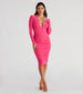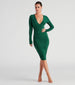 Dare to show off your killer curves in this bodycon midi dress featuring long sleeves, a plunge V-neckline, and side ruched seams to create an hourglass appearance on slinky-knit fabric. Complete the look with clear strap heels.Â
