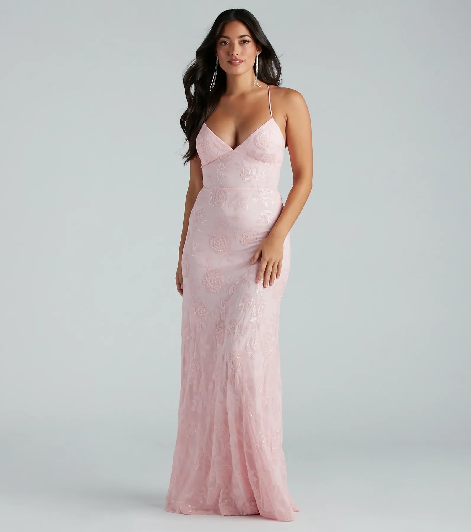 The ultra-glam Kleo formal sequin dress is ready to hit the dance floor at homecoming, weddings, or formal parties! She shines in a sleeveless V-neckline, a lightly padded bust, spaghetti straps that create the lace-up back, and a curve-hugging mermaid silhouette that gracefully flows into a floor-length hem. The formal dress is designed with a unique rose sequin pattern for a fresh style on mesh fabric with a stretchy knit lining. Complete the look with earrings and a clutch!