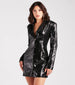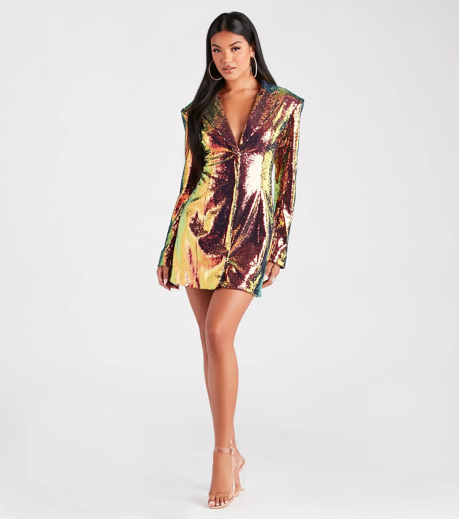 Your next jazzy affair demands the Kristina sequin blazer dress to strike the crowd with your modern shine! She features long sleeves, shoulder pads for a structured fit, a lapel collar V-neckline, hidden front snap-button closures, a slim-fitting silhouette, and a mini-length hem. The formal party dress is crafted with a gorgeous array of shimmering iridescent sequin-embellishments all over and has a woven lining. Complete the look in sassy lace-up heels for a dressy occasion!