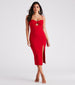 The Laila midi dress offers a playful twist for cocktail parties and dinner dates! She features a sleeveless sweetheart neckline, adjustable spaghetti straps, a twisted bust with a keyhole cutout, a form-hugging silhouette, and a flirty front slit along the hem. The formal dress is composed of a lined crepe fabric with a moderate stretch. Complete the look with hoop earrings and heels.