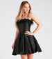 Vivacious and chic, the Lennon satin formal skater dress will dramatically level up your party look! She features a sleeveless subtle sweetheart neckline with a fabulous ostrich feather trim, adjustable spaghetti straps for a customized fit, and a fitted bodice with flexible boning inserts to provide structure. Her high waist seam flows out to a short pleated skater skirt with hidden side pockets and a flirty fit and flare silhouette with a tulle lining. The smooth satin woven fabric includes a full woven lining. Style with lace-up heels.