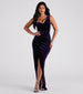 Sultry and sophisticated, the Lillian formal velvet wrap dress will be a show-stopper at dances, galas, and balls! She features a sleeveless sweetheart neckline with a padded bust, a one-shoulder design with a wide strap, a slim-fit bodice leading to stylish pleating at the waist, and a curve-hugging, floor-length silhouette with a wrap-front design creating a chic front slit. The luxe velvet fabric offers a moderate stretch. Complete your look with rhinestone duster earrings.