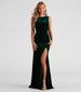 Luxurious velvet creates a charming holiday party-ready look for the Lindsey formal dress! She brings classy glamour in her traditional sleeveless boat neckline, wide shoulder straps, a built-in padded bust, and a princess seam bodice leading to the mermaid silhouette with a high-cut front slit along the floor-length hem. Showcase a sultry show of skin in her head-turning open-back design with a wire insert and ruched seam that accentuates your curves. The formal dress is composed of a smooth velvet fabric with a sewn-in lining and a moderate stretch. Complete your dressy look in a stunning hair accessory and clutch.