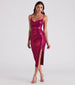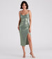 Glimmering and shimmering metallic creates the perfect shine on the Liv formal midi dress to stun at birthdays, themed parties, and school dances! She features a sleeveless cowl neckline with spaghetti straps, a form-hugging silhouette, and a side pleated seam that leads to her asymmetrical wrap hem with a slit. The formal dress is composed of a sparkling metallic knit fabric with moderate stretch. Style with rhinestone strap heels to complete the look!
