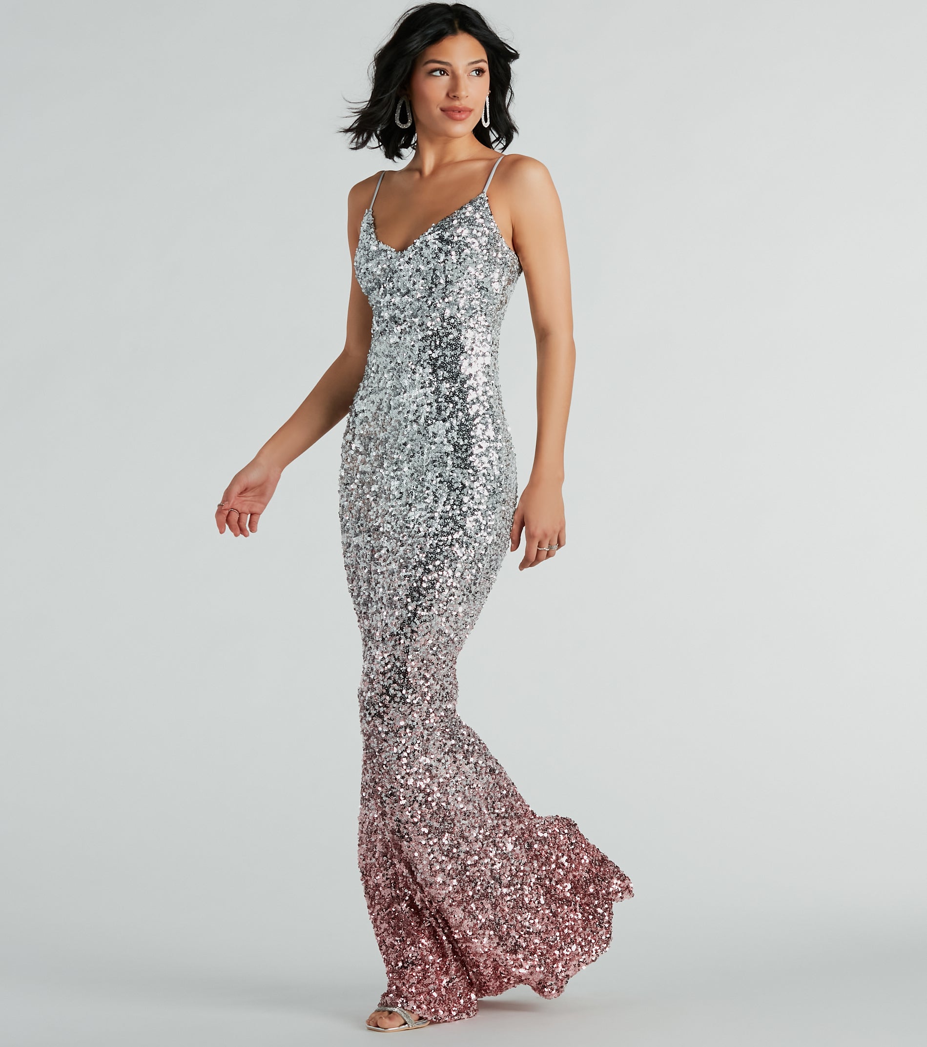 Shimmer and shine like a Hollywood star in the Lizzy sequin long formal dress at prom, fancy birthdays, or red carpets! Covered in head-to-toe sequin embellishments, she sparkles in a flattering V-neckline that flaunts your bust and sleek adjustable spaghetti straps to give you a perfect fit. The mermaid silhouette gracefully hugs your curves down to the dramatic floor-length hem with an ombre effect that adds color to your night! Complete the look with this captivating formal gown with earrings, a chic clutch, and heels for an unforgettable evening ensemble!
