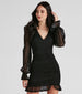 Talk that talk and walk that flirty walk! This v-neck mini dress will make you irresistibly cute featuring sheer long sleeves with elasticized cuffs, dual ruched front seams, a bodycon silhouette, and a ruffle trim hemline. Complete the look in platform heels.