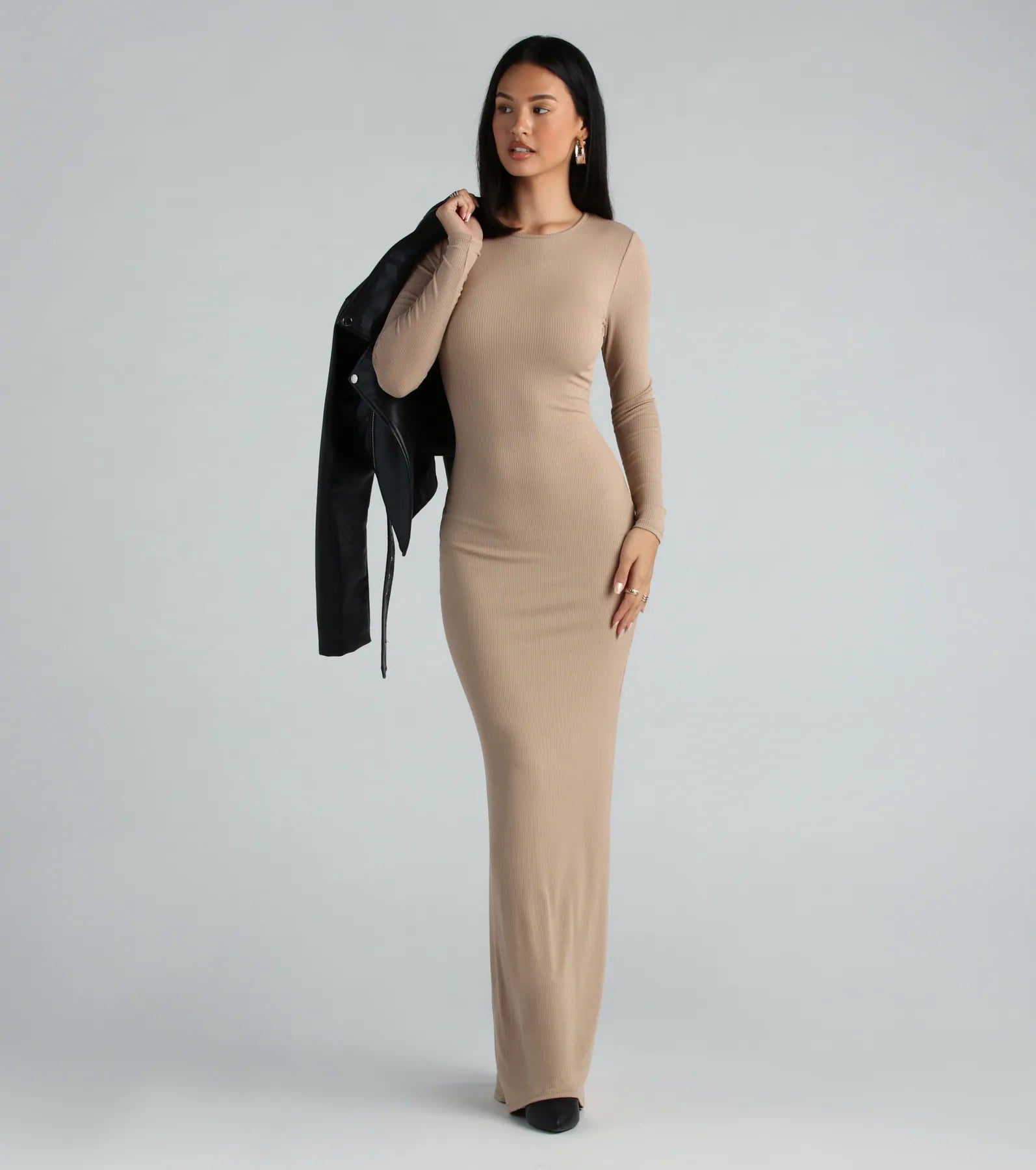 Dare to be bold this season and fall in love with this basic maxi dress! Its fitted long sleeves, crew neckline, and bodycon silhouette hug your figure in all the right places all the way down to the maxi-length hem. The dress is composed of a double-lined rib knit fabric with plenty of stretch. Complete the look in block heels and a handbag for any day or night occasion!