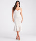 Love will be in the air with you in this romantic lace midi dress for engagement parties, bridal showers, or rehearsal dinners! The midi dress features a sleeveless sweetheart neckline with a built-in padded bust, spaghetti straps that lead to an open back with a cross-back lace-up strappy design, flexible boning inserts at the bodice to create an alluring corset design, a hip-hugging silhouette, and a midi-length hem with an adorable ruffled trumpet hem. The sheer floral lace fabric includes a full-length knit lining. Style with rhinestone hoops and clear heels.