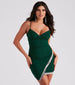 You'll fall in love with the sparkling details of this rhinestone trim mini dress! It features a sleeveless V-neckline with a surplice design, adjustable spaghetti straps, pleating at the waist, a faux wrap-front skirt with an asymmetrical mini-length hem, and a glitzy rhinestone accent trim. The dress offers a curve-hugging bodycon silhouette. Style with strappy stilettos.