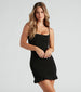 Love the limelight? Attract all the attention in this crepe mini dress featuring a sleeveless, scoop neck, spaghetti straps, princess seams along the bodycon silhouette, and a flirty ruffled hem. Complete your dressy look in fringe earrings and heels.