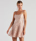 You'll be the center of attention in the stunning Lucia party dress! She features a sleeveless scoop neckline with a padded bust and a structured bodice, adjustable spaghetti straps, and an alluring open back with a lace-up strappy design for a customized fit. Her high waist seam flows out to a short party skirt with a fit and flare silhouette. The lined lace fabric features a metallic thread woven throughout. Style this dress with glitzy earrings.