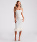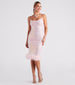 Simply pretty and elegant. The Lucinda sequin formal dress sparkles for brides-to-be, birthday girls, or graduates! She features a sleeveless scoop neckline, adjustable spaghetti straps for a customizable fit, a form-hugging silhouette, and a feathered midi hem with a back-slit accent. The formal dress is composed of a sequin-embroidered mesh fabric with a stretchy knit lining. Style with earrings, a bracelet, and heels to complete the look!