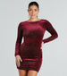 This gorgeous glitter velvet mini dress will bring the luxe energy to your formal party looks! Crafted from a velvet fabric with sparkly glitter detailing in an intricate diamond-shaped pattern, this mini-length dress features a high crew neckline, long fitted sleeves, a V-back with a cross-over design and lower back cutout, and a bodycon silhouette. Complete your glitzy outfit with rhinestone fringe earrings.