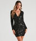 Keep your look luxe and glamorous in a sequin dress that slays! This mini dress features a V-neckline, long fitted sleeves, a short, curve-hugging silhouette, and all-over sequin embroidery in a chic scroll pattern. The sheer mesh fabric includes a full knit lining. Style with lace-up heels for your next cocktail party.