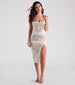 From cocktail soirees to evening art gals, the Maggy formal dress delivers sophistication to every event! She features a sleeveless sweetheart neckline, adjustable spaghetti straps, a cowl pleat overlaying the lightly padded bust, and a corset-style bodice with flexible boning. Her figure-flaunting silhouette leads to the midi-length hem with a flirty slit accent to show some skin! Complete the look with a clutch and lace-up heels.