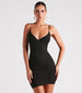 Make your move out on the dance floor in this sassy mini dress sure to get all the attention! The sleeveless dress features a surplice V-neckline, spaghetti straps, and side and front ruched seams that define your curves along the bodycon fit. Complete the look with a rhinestone bracelet and heels.