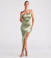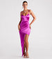 A luxe style with gorgeous detail, the Margret formal satin dress brings class and elegance to wedding guests, dinner formals, and banquets! She features a sleeveless V-neckline, spaghetti straps that cross in the back, and a pleated hip seam leading to the form-hugging asymmetrical silhouette with a stunning side slit cutout and long hem. The formal dress is composed of a buttery smooth silky satin fabric that reflects light with a subtle sheen effect. Complete the look in a statement necklace set and strappy heels.