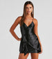 Radiate sultry glamour in the Margret satin party dress sure to leave a lasting impression! She stuns in a sleeveless v-neckline, spaghetti straps that lace up along her open-back design, and a curve-hugging, faux wrap mini-length hem with a ruffle. The formal dress is composed of luxurious silky satin fabric. Complete the look in linear earrings and heels.