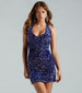 Strut confidently in the daring Maya velvet sequin mini dress at bachelorettes or Vegas weekends! She features a halter V-neckline, an open-back to flaunt some skin, a flattering bodycon silhouette, made of shimmery velvet sequins. Conquer the night with this mini-length dress! Style with fringe earrings and heels.Â