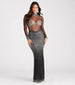 Showcase a stunning sultry sparkle with the iridescent radiance of the Milana rhinestone sheer mesh formal dress! She features a completely sheer mesh top with a high mock neckline, long fitted sleeves, and a back zipper closure. Her high V-cut waist leads to a long knit bottom with a floor-sweeping hem, a back slit accent, and a slim-fit silhouette. She features iridescent rhinestones with a sexy bust design and more rhinestone embellishments that cascade down the length of the dress. The mesh and knit fabrics offer a moderate stretch. Complete your look for a glamorous soiree with rhinestone fringe earrings.