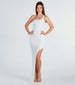 Let the celebration and compliments begin when you arrive in the Mishka formal long dress as the lovely bride or birthday princess! She features a one-shoulder neckline and wide shoulder strap, a high side slit, and faux pearl and rhinestone embellished mesh fabric to add a touch of luxury to this elegant piece. Complete the look with jewelry and strappy heels.