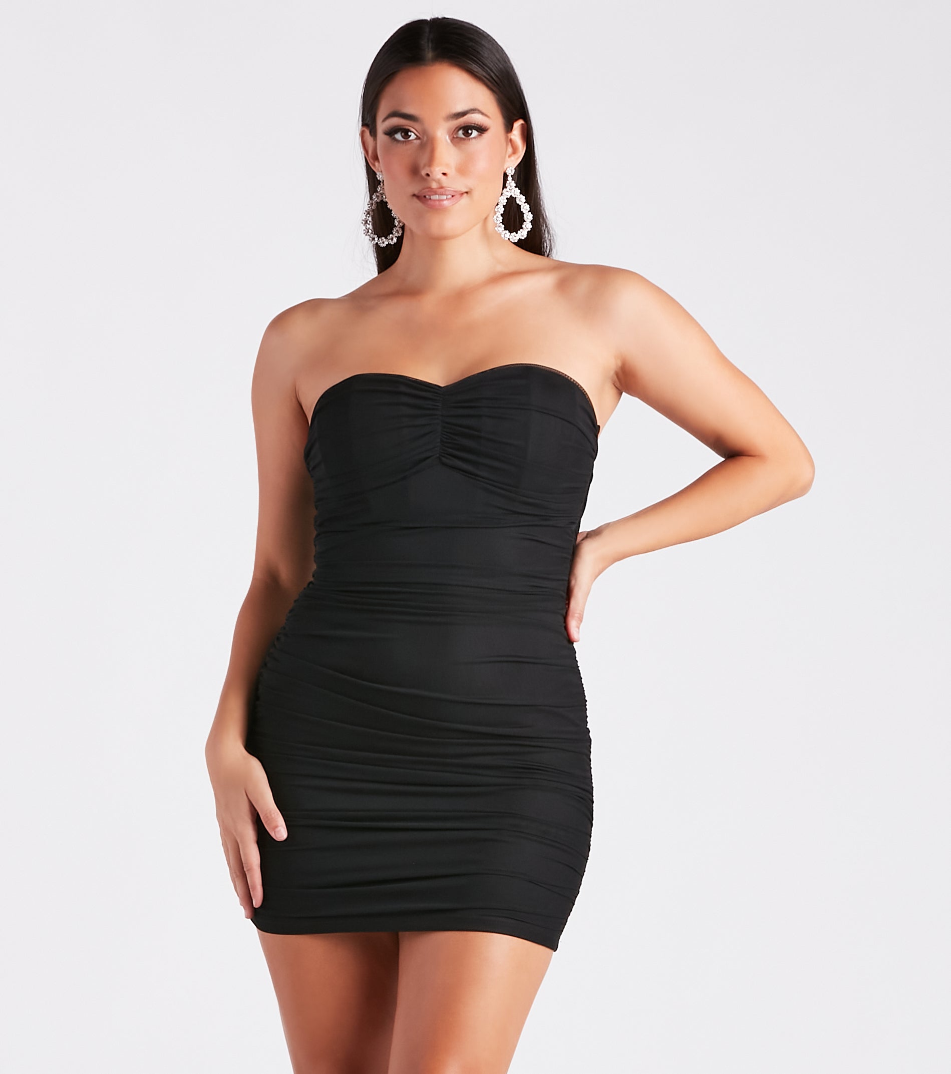 You'll be Miss Hot right now in this strapless mini dress - sure to light up the dance floor! It features a sweetheart neckline, non-slip grip lining, and side ruched seams to flaunt your curves and a bodycon silhouette. Complete the look in sassy platform heels and earrings.