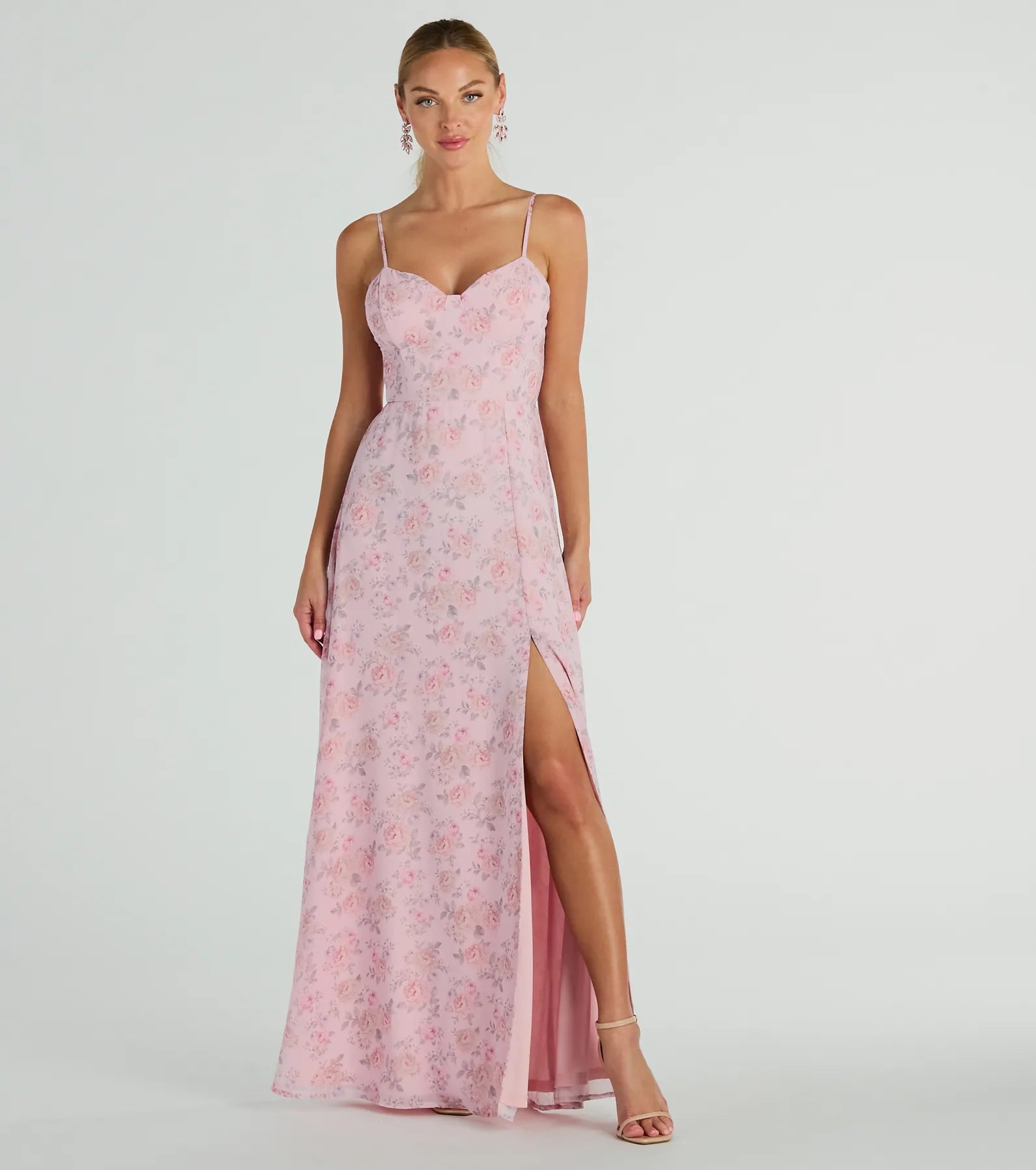 Have your moment of beauty during soiree hour in this floral maxi dress perfect for showers or garden parties! The vibrant floral print adds an extra touch of fun to this maxi length dress. Featuring a playful lace up back, adjustable spaghetti straps, and a high front slit, this dress will have you looking effortlessly chic! Complete the look with earrings and block heels.