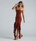 Take on timeless style in this strapless midi dress for enchanting moments at every soiree! The knee-length dress features a strapless neckline, a bodycon silhouette, dual front slits, and cascading ruffle trim down to the hem to create a voluminous effect. The smooth knit fabric offers plenty of stretch. Complete the look in strappy heels.