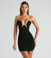 Cause a scene strutting into the party in this heat stone mini dress! It features a strapless plunge sweetheart neckline with a wired structured design, a curve-hugging bodycon silhouette with ruching, and all-over iridescent heat stone embellishments. The dress is composed of a sheer mesh fabric with a full knit lining. Complete your saucy look in chic block heels.