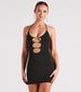 Step up your night out attire with this fab mini dress sure to have all eyes on you! Featuring a sleeveless plunge halter neckline with a trio of chain-twist trim, tie-back neck spaghetti straps, and a form-hugging silhouette. Complete the look in a ring set and heels.