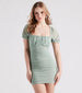 This square neck dress is ready for your next trip somewhere fab! The dress features adorable short puff sleeves, a ruched bust, an empire waist, and side ruched seams that contour to your curves along the mini, bodycon silhouette on mesh-lined fabric. Complete the look in lucite mules.