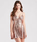 You'll be looking so perfect in this sequin skater dress for your cocktail party or dressy celebration! The mini dress features a sleeveless V-neck, spaghetti straps that lace up in the back, and a fit-and-flare silhouette with a short-length hem. Complete the look in lace-up heels.