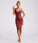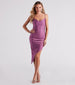 Showcase an alluring vibe for a night out on the town in this sleek sleeveless midi dress! It features a trendy cowl neckline, spaghetti straps, shirring at the waist, an asymmetric midi-length hem creating a chic side slit, and a bodycon silhouette that will hug your curves. The smooth knit fabric offers a moderate stretch. Style with clear heels.
