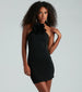 This rosette halter mini dress will have you looking oh-so-chic and ready for romance! It features a sleeveless halter neckline with a bold textured rosette flower applique, tie-back halter straps, a mini-length hem, and a bodycon silhouette that will hug your curves. The crepe fabric has a moderate stretch. Complete your dressy dinner date look with strappy stilettos.