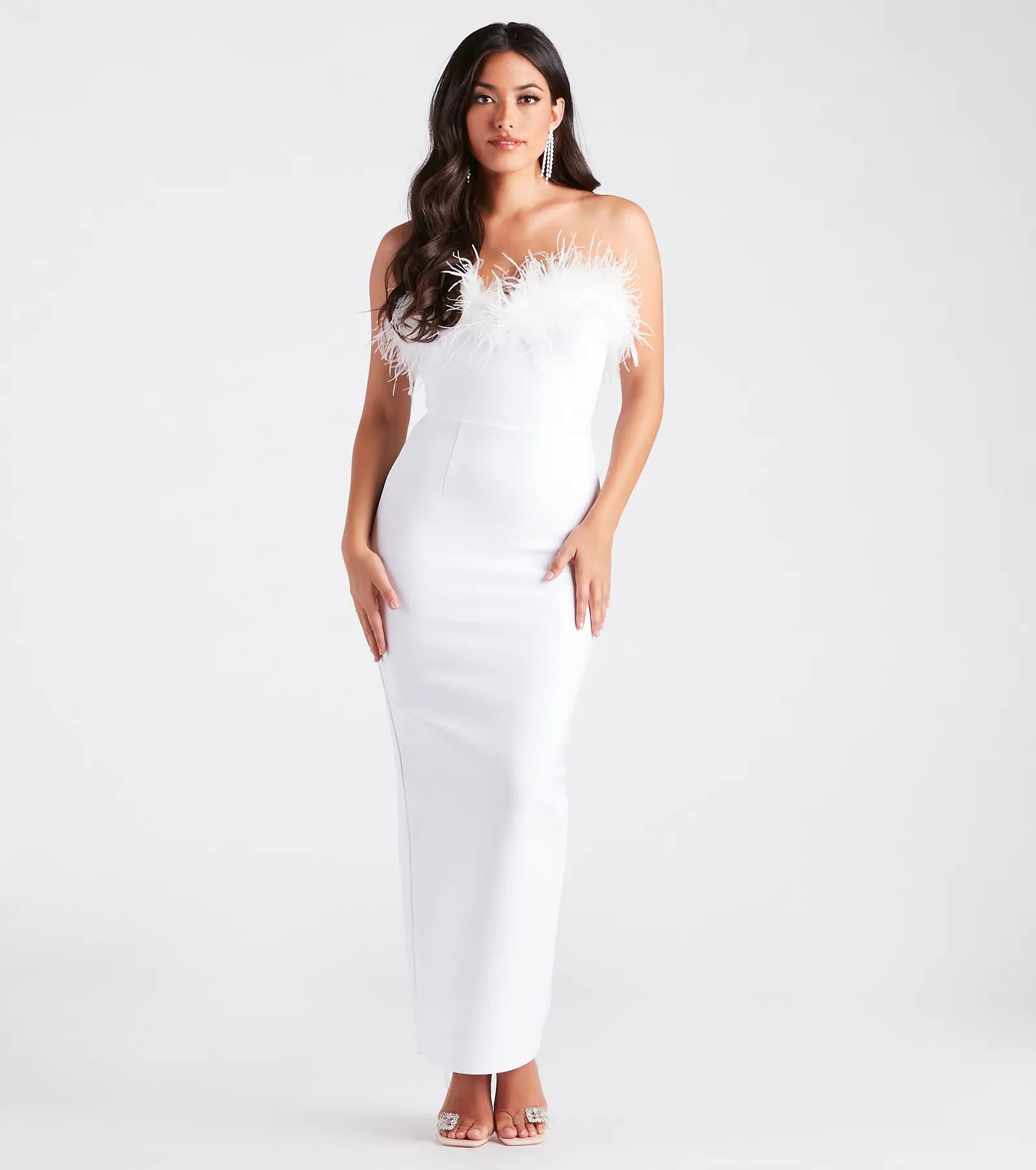 Show off a sexy silhouette in the stunningly chic Olivia formal marabou feather bandage dress! She features a strapless wired V-neckline with a fabulous marabou feather trim for a flirtatious flair, a flattering high waist seam, a hidden back zipper closure, and a long-length hem with an alluring back slit accent. The textured bandage knit fabric offers a curve-hugging fit for a smooth and sculpted look with plenty of stretch. Complete the outfit in this long dress with strappy stilettos for your next black-tie affair.