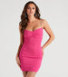 Showcase your love for glam on the down low! This sassy crepe mini dress features a rhinestone and faux pearl adjustable straps, a v-neckline with a bust ruched seam, a high-waist band, and a curve-hugging silhouette. Complete the look in rhinestone embellished heels for some shine!