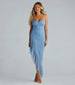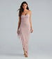 Have the last dance out on the floor in this glitter mesh maxi dress perfect for celebrations! It features a V-neckline, spaghetti straps, a form-hugging silhouette, and an asymmetrical ruffled maxi-length hem. The glitter mesh fabric includes a stretchy knit lining. Complete the look with stylish stiletto heels.