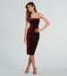 This stunning ruched velvet midi dress will bring only chic vibes to your next cocktail party. Crafted from a luxe smooth velvet fabric, this mid-length dress features a sleeveless square neckline, spaghetti straps, ruched detailing at the waist for a figure-flattering look, and a form-hugging silhouette. The velvet fabric offers a moderate stretch. Complete your dressy 'fit with strappy stilettos.