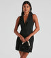 Bring only chic vibes in this on-trend fitted vest dress. It features a sleeveless bodice, a V-neckline with a lapel collar, a button-down front, and a mini-length silhouette. Style this crepe woven dress with an embossed handbag and strappy heels.