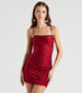 This alluring bodycon mini dress was made for a night out dancing! It features a sleeveless square neckline, spaghetti straps, ruched detailing down the front, and a short, curve-hugging silhouette. The smooth knit fabric offers plenty of stretch. Style with your fave heels.