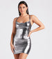 Feel like a total space babe in this metallic mini dress at the club! Featuring a sleeveless cowl neckline, spaghetti straps, a bodycon silhouette, and a mini-length fitted hem. The smooth metallic knit fabric has a moderate stretch. Complete the look with statement platform heels.