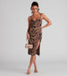 Look perfect in paradise wearing this palm print midi dress featuring a sleeveless, v-neck, spaghetti straps, a form-fitting silhouette, and a front slit accent on stretchy knit fabric. Complete your vacation look in wedges.