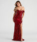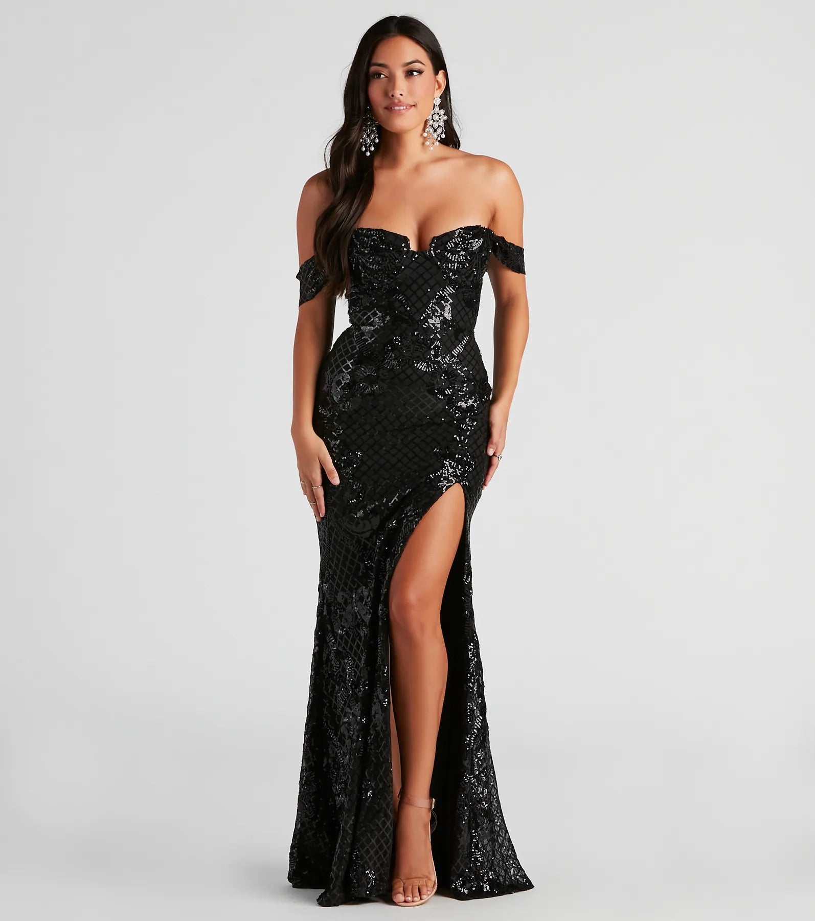 Bring the regal vibes to your formal night-out look in the gorgeous Penelope mermaid dress! She features a flattering off-the-shoulder sweetheart neckline with short fitted sleeves, a structured and padded bust, a high waist seam, and a floor-length mermaid silhouette with a chic high side slit. The lined mesh fabric features sequin embroidery in a stunning criss-cross and scroll pattern. Complete the look with chandelier earrings.