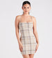 Find your perfect match in this casual-chic plaid mini dress! Featuring a sleeveless square neckline, spaghetti straps, an open back with a cross-back lace-up strappy design, a mini-length hem, a form-hugging fit, and a classic plaid windowpane print, this dress is a stylish must-have. Pair with hoop earrings and clear mules.