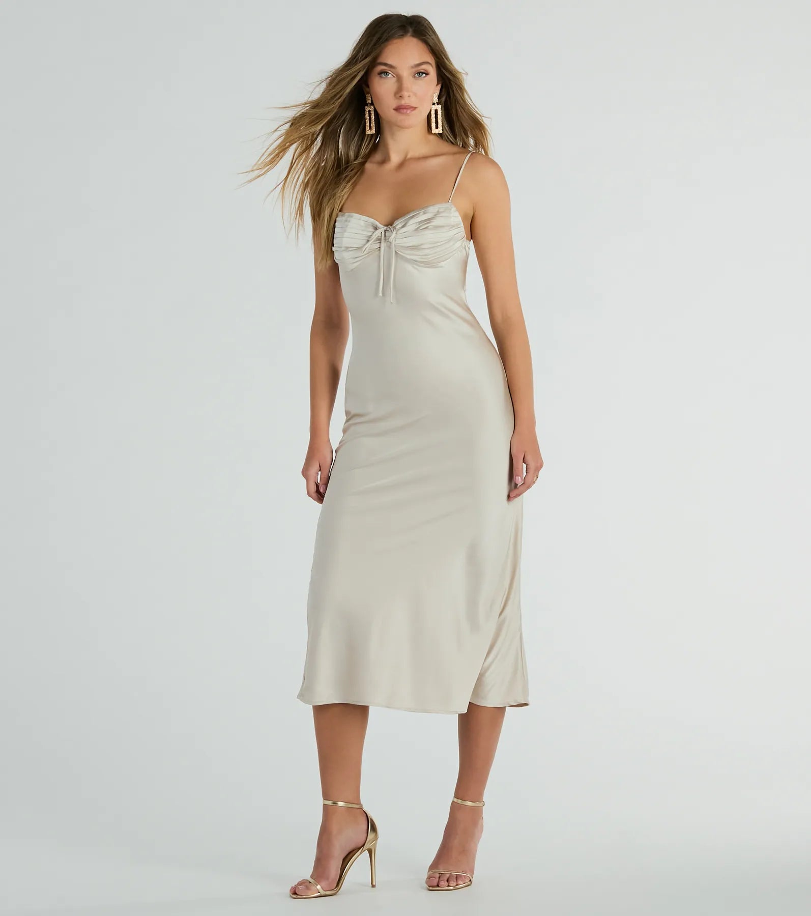 Feel perfectly poised for any occasion in this satin midi dress! Featuring a sweetheart neckline and adjustable straps, this dress accentuates your curves in a flattering silhouette. The pleated bust with a bow and open back adds a touch of elegance, making it ideal for cocktail parties or rehearsal dinners! Complete the look in stiletto heels.